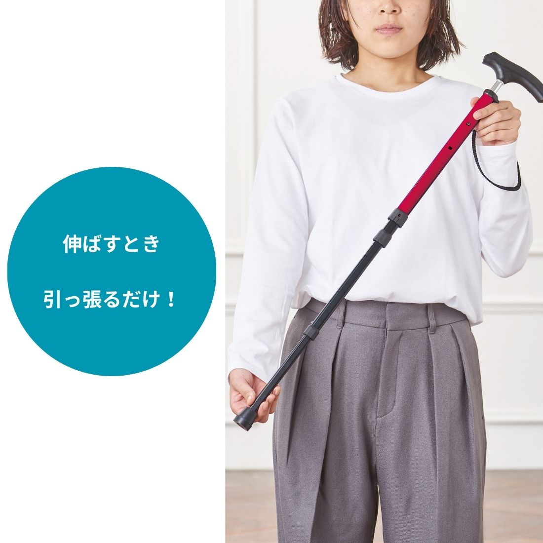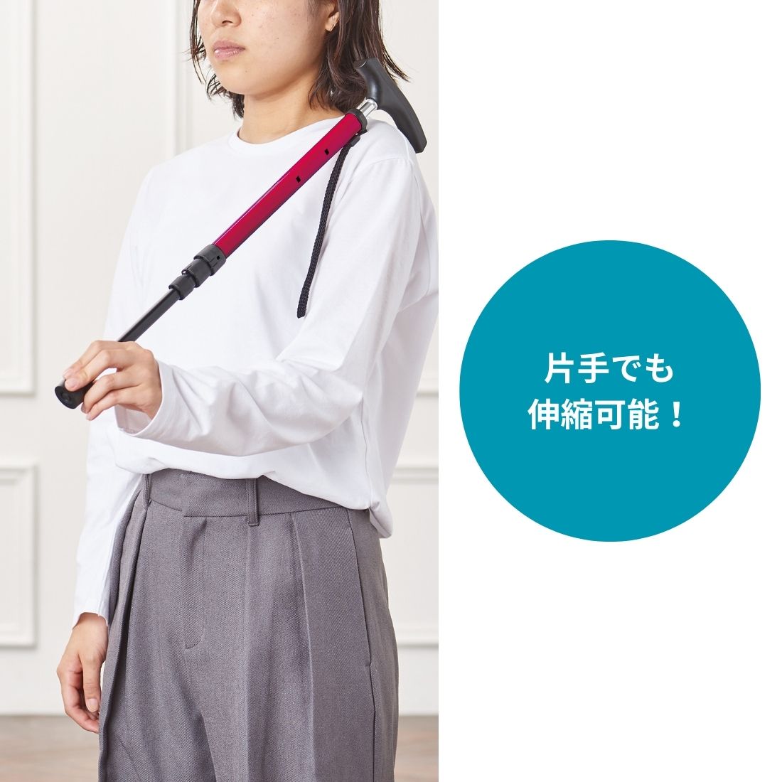 長さは約75~91cmで長さ調節可能、身長144~176cmに対応。片手で簡単に伸縮できるので、使いたいときにすぐ使えます。